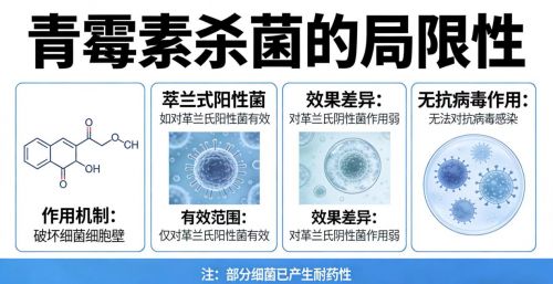 - 抗菌谱极窄:仅对部分细菌有效,对病毒、真菌、耐药菌(如MRSA)、芽孢几乎无效;