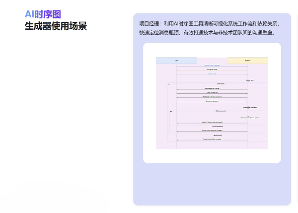 它还能智能分析API调用、微服务通信等复杂场景,辅助开发团队发现流程瓶颈。GitMind指出,AI时序图工具不仅适用于技术人员,也能帮助项目经理、设计师或市场人员快速理解系统运作机制。