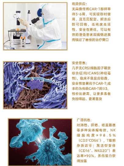 即用型产品属性:异体NK细胞可提前制备、冻存备用,实现“现货型”应用,大大缩短患者等待时间。