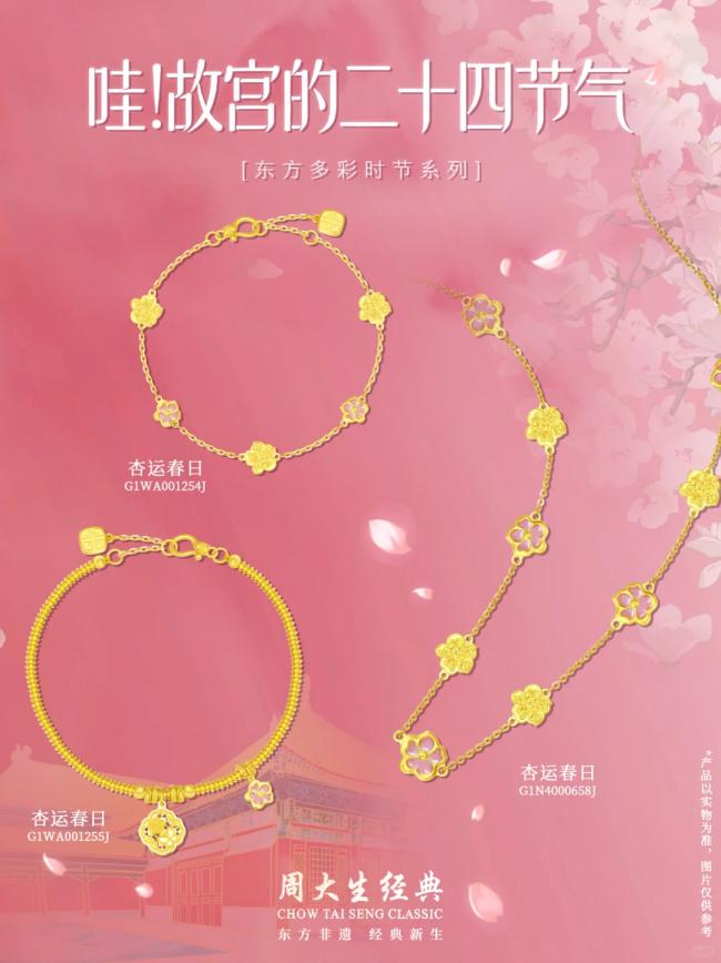 周大生经典携手“哇!故宫的二十四节气”IP打造的“哇!故宫的二十四节气”系列,将紫禁城的春日花信凝练为腕间颈侧的恒久陪伴。品牌以黄金为载体,让非遗二十四节气的时序之美,化作可佩戴的文化印记。这背后,是周大生经典一贯的追求:打造兼具文化深度、艺术价值与时尚表达的非遗文创珠宝品牌。